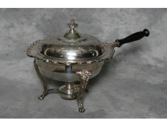 Gorgeous! This fabulous silver plated serving dish with ornately decorated lid and legs, will keep your food warm in style. With a beautifully hidden steno burner, your food will remain warm and your guests happy.