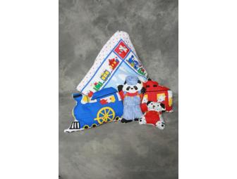 Any little boy will enjoy this hand made train themed pillow and comforter set. With engines and trains in bright primary colors and cute animals, this set will bring joy to the little boy in your life.