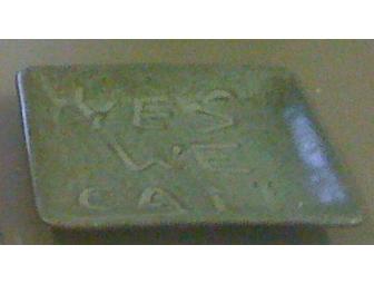 Square ceramic plate that say "YES WE CAN" by local Yellow Springs artist Michael Jones.