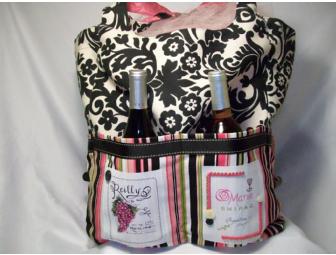 This black and white with pink all over shopping tote and wine bag is perfect for picnics or carrying treats to holiday parties. Complete with eight external wine bottle pockets, four of the pockets are detailed with delicately hand-painted panels. Detailed with two corks on each end, this bag measures 18 inches long, 9 inches wide and 15 inches tall. Christie Bieber of Virginia Grape Escapes gets the party started by donating two bottles of wines with the bag.