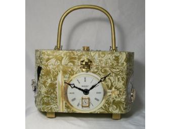 This eye-catching wooded purse will stop traffic on the street or impress visitors in the home. Also beautiful as a jewel box, this purse is decoupaged with photographed clocks and timepieces and real watches sans strap. Detailed with clear, faux gems and brushed in gold paints, the interior has clear gold outlines. This purse measures 10 inches long, 6 inches wide, and 4 inches tall.