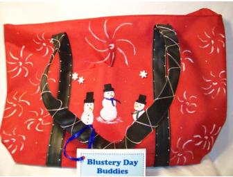 Perfect as a gift for a friend or a token of your appreciation for a teacher, this handpainted red bag matches the winter cheer like no other. Two 1.25 inch black straps vertically line the bag. Lined with red, black, and gray polka dots, the bag includes a zipper compartment. This bag measures 20 inches long, 5 inches wide, and 13 inches tall.