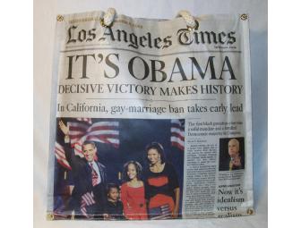 This tote features a November 5, 2008 Los Angeles Times with the headline "IT'S OBAMA". The bag has a top velcro closure and 9.5 inch, riveted rope handles. The bag measures 12"x12"x3".