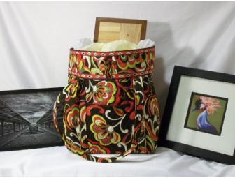 Kelley's on Patterson Avenue donated this beautiful brown, red, lime, white, and tangerine Vera Bradley satchel. Measuring 15 inches long and tall and 12 inches wide, this satchel is perfect as a laptop carrier, an eco-friendly way to shop for groceries, or as a stylish bag. Inside the bag, you'll find several works of art to decorate your home: A color print of exotic bird donated by artist Beth Thomas (bthomasstudio.com); a black and white photograph of the Virginia Science Museum donated by James Betts (jamesbettsphotography.com); a recycled oak pallet trivet donated by Robert McCarthy; a Nina Jackson painting; and a Page McCarthy necklace.