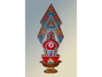 This beautiful Torma is hand painted and filled with precious blessed substances. Each one is made according to the definitive instructions given personally to Lama Tharchin Rinpoche by His Holiness Dudjom Rinpoche. Tormas may be used as practice supports or displayed as sacred art in the home.